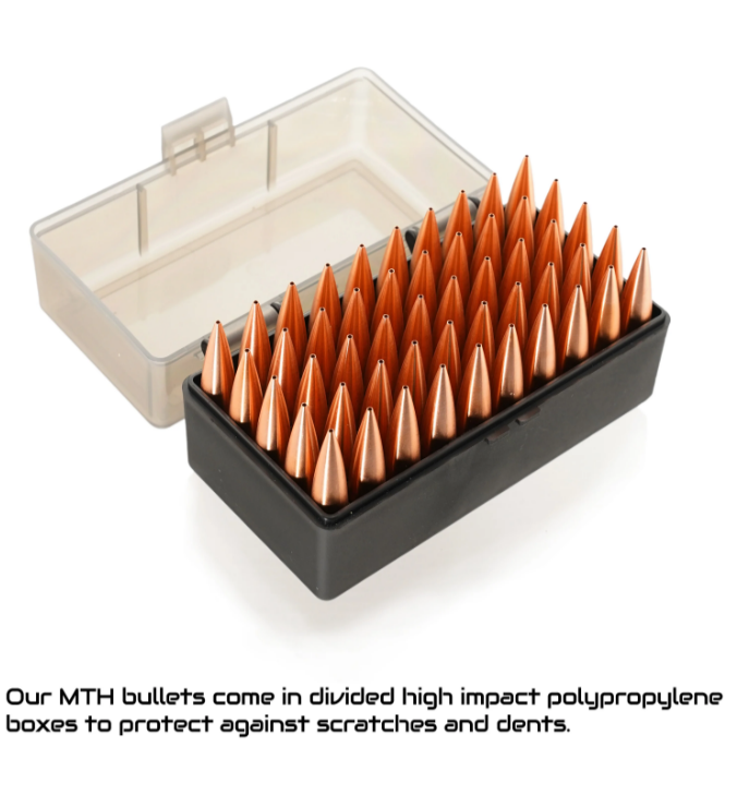 Our MTH® line is machined out of lead free solid copper bar stock on a CNC lathe. These are a high BC, expanding bullet designed for hunting at all ranges.