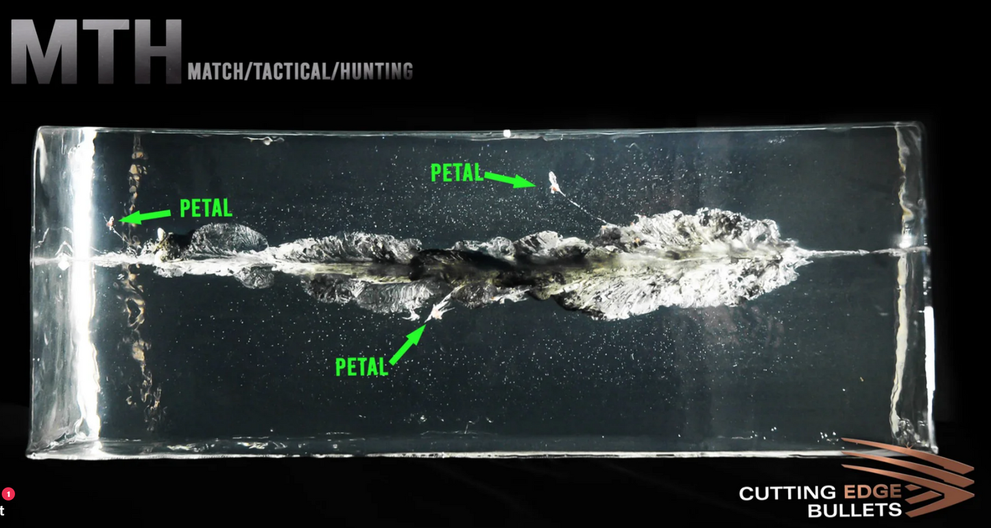 These bullets do not mushroom, but instead, fracture. After 1-2" of penetration, 3-4 petals will break off and radiate outward from the main wound channel about 2-3" creating massive trauma. They will expand down to 1600fps.