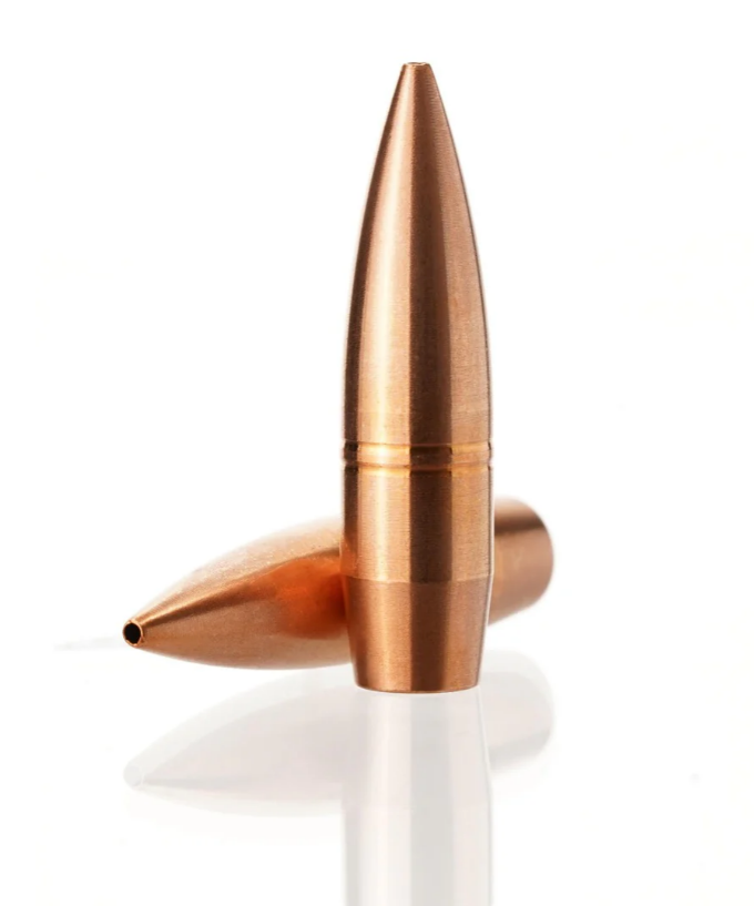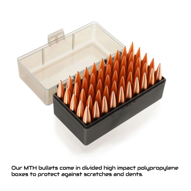Our MTH® line is machined out of lead free solid copper bar stock on a CNC lathe. These are a high BC, expanding bullet designed for hunting at all ranges. A unique feature of this bullet is our patented SealTite® band which is a band slightly larger than caliber diameter around the bullet which was designed to eliminate fliers by preventing gas blow-by. The SealTite® band also decreases copper fouling which is typically associated with mono metal bullets.