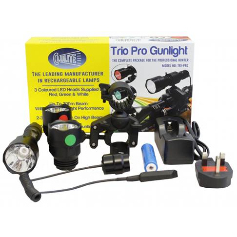 Torch, Red, Green & white LED heads, Rechargeable 18650 Li-ion battery, Mains charger, Dual gun mounting kit suitable for scope sizes 25 & 30mm, Stock mountable remote switch & Wrist strap