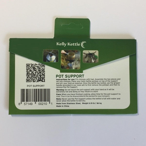 a) This Pot Support lets you place the Kelly Cook Set on top of the Kettle as your water boils, thereby harnessing all the heat that is generated in the chimney and ensuring maximum fuel efficiency. The Kettle works remarkably well in stormy weather - hence the Pot-Support allows for an element of cooking even in extremely harsh weather conditions. If more fuel is required as you cook/boil up, simply remove your pot/pan using the gripper handle (all in our cook set) and feed additional fuel through the Pot Support. You don't need to remove the pot support from the chimney when refuelling. When you have finished cooking, allow time for the pot-support to cool. Then it can be disassembled, flat-packed and inserted up the chimney of the kettle for transport.