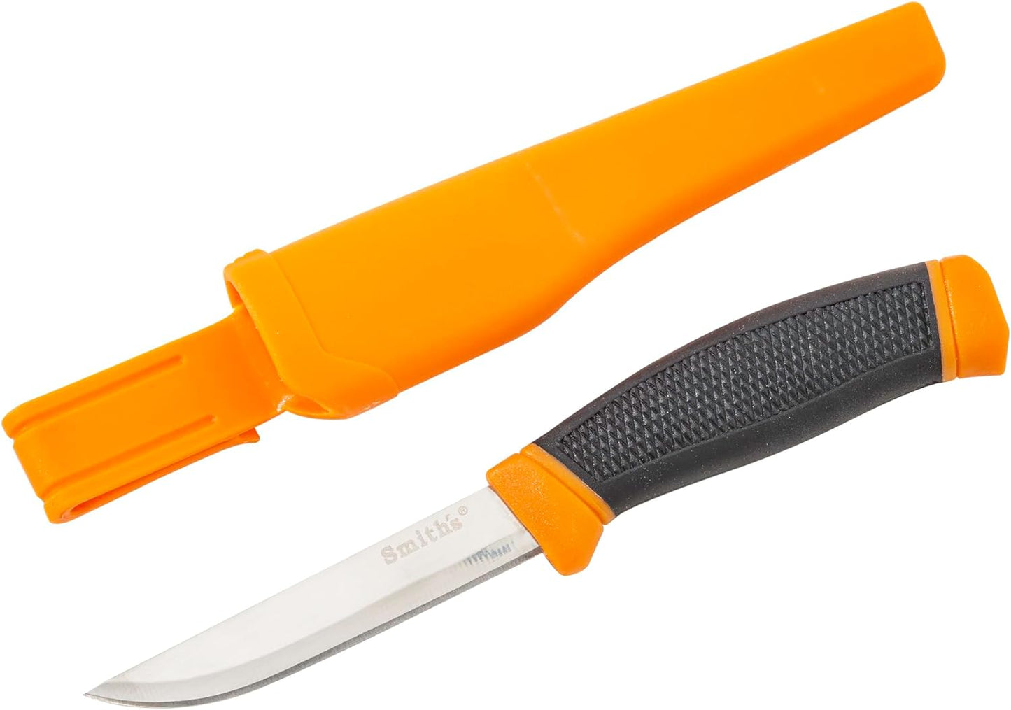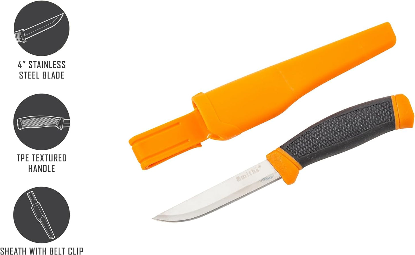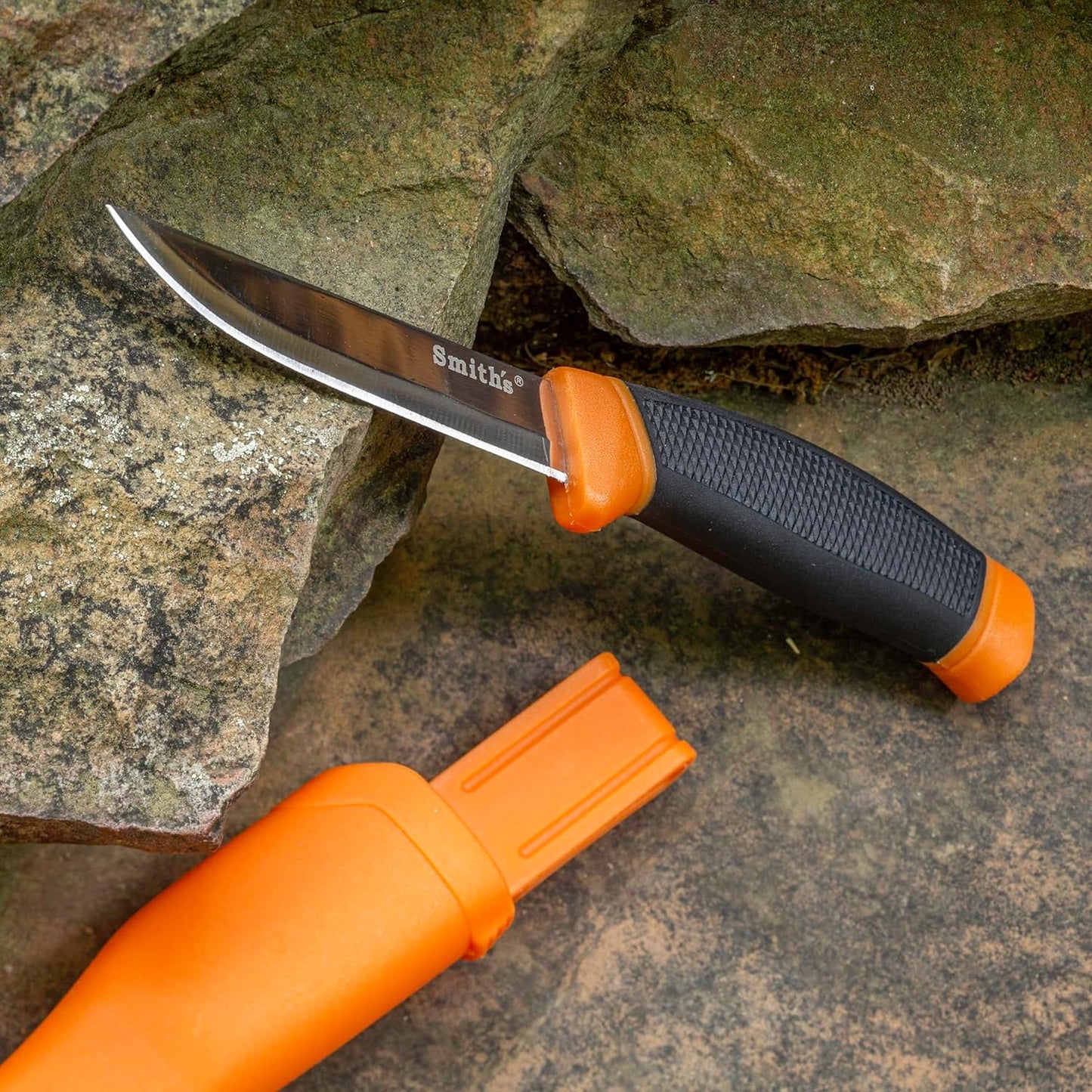 - 4” BUSHCRAFT KNIFE – Smith’s 4-inch Bushcraft Hunting Knife is made with high-quality stainless steel for extended, versatile use. From hunting, carving, fire starting, or food prep this bushcraft knife has you covered and comes with a breathable protective sheath that protects you and the blade when not in use.