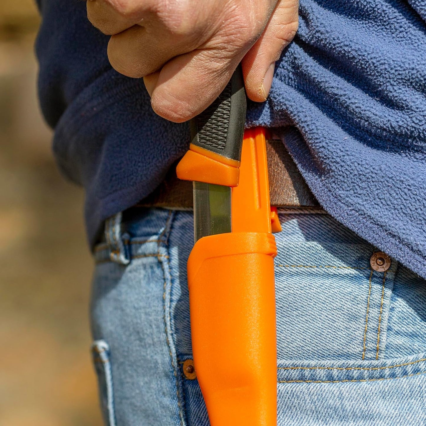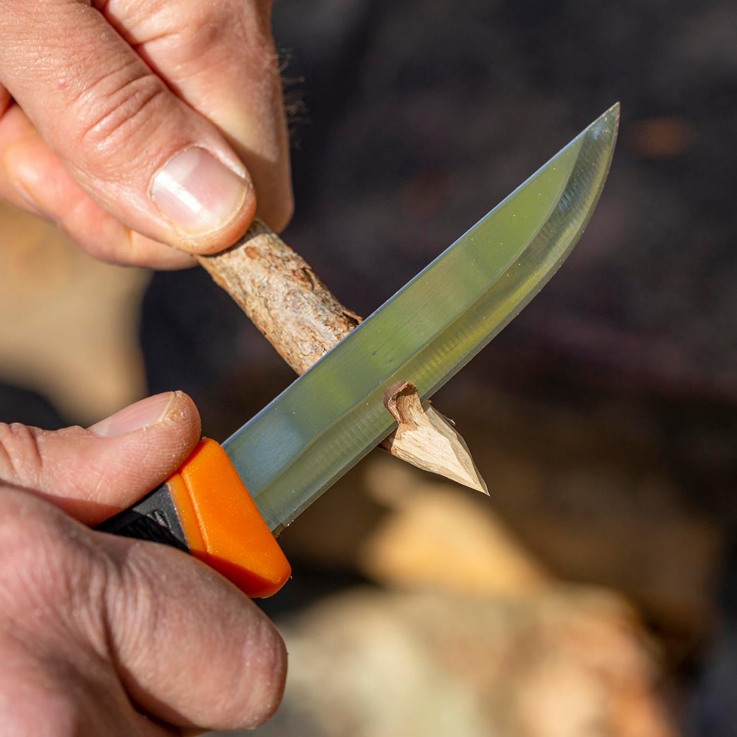 - STAINLESS STEEL BLADE – This hunting and outdoor knife features a fixed 4-inch razor-sharp blade made of stainless steel. Easily start fires, whittle, or carve wood, cut rope, skin game, and much more with this versatile lightweight knife. Its compact size makes it easy to store and sharpen whenever needed.