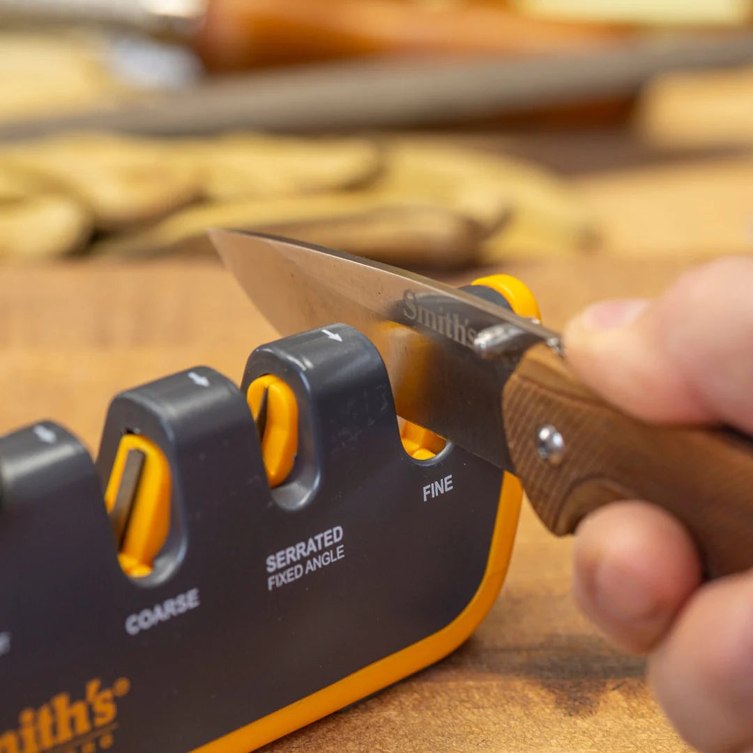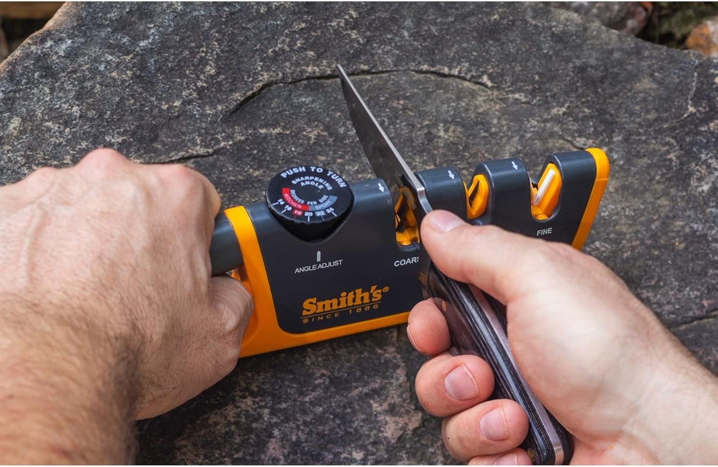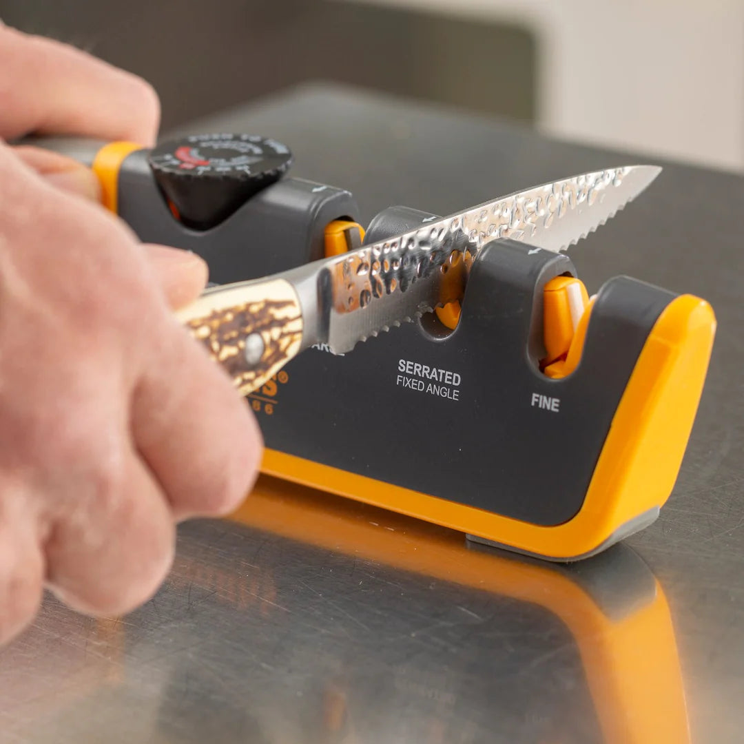 The Adjustable Angle Pull-Thru Knife Sharpener offers new, innovative features never used on a manual knife sharpener and functional performance unmatched by standard edge maintenance products. This sharpener offers two stages of sharpening (COARSE and FINE) for all types of straight edge knives with a grind on both sides of the blade and a fixed-angle slot for sharpening serrated edge blades. It will sharpen a wide variety of knives by simply adjusting the angle of the abrasive components to match the angle of the original factory grind. Just turn the dial to one of the 6 angles offered, then pull your knife through the appropriate slot(s). It's that easy! Stop messing with those difficult to use, cumbersome, and timely Precision Sharpening Kits and get an Adjustable Angle Pull-Thru Knife Sharpener from Smith's.