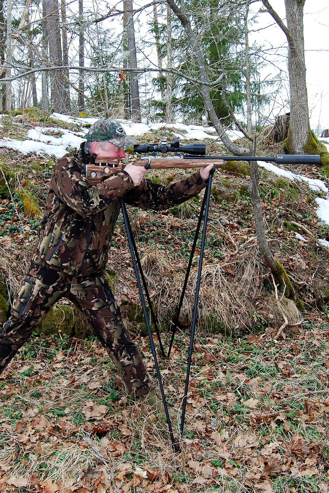 - There is a built-in transmission in both top sections, ensuring that they are always in the same position, relative to the legs’ spread angle. (like a compass). With this system it is now possible to spread out the leg’s, to the normal standing shooting height, if you grasp the handle on the side and around the left pair of legs and lift the sticks off the ground. Squeeze the handle. If you need a little higher or lower rest, due to the nature of the terrain, you can just fine tune by grabbing one leg and adjust the spreading angle. If you want to use the stick for sitting or kneeling shooting position, simply shorten the legs and spread them out to the needed angle.